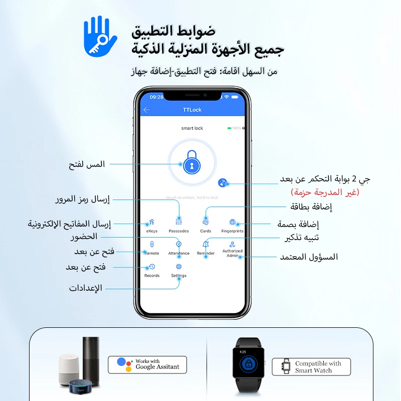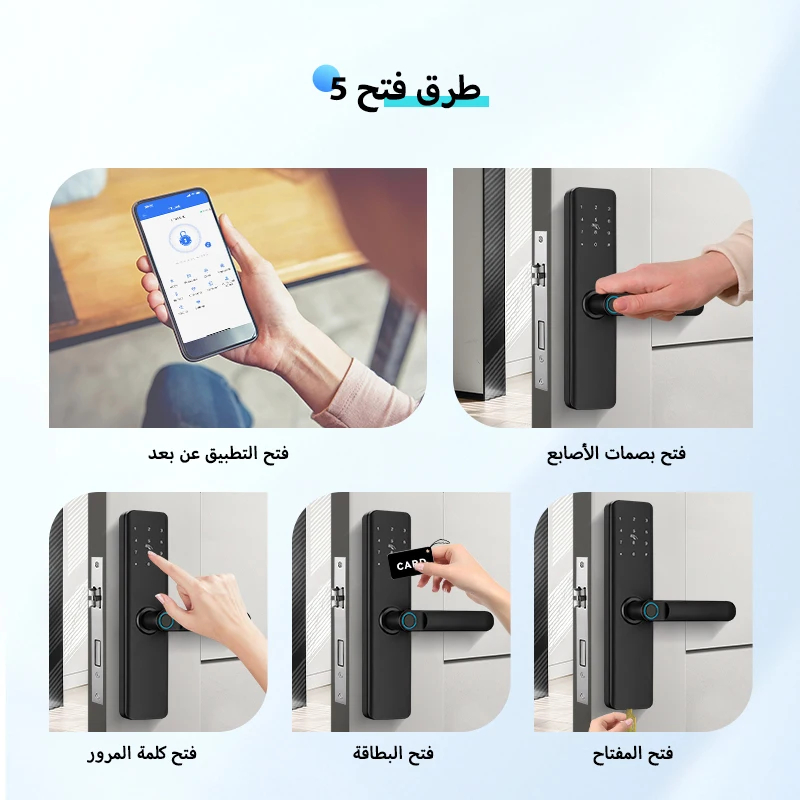 بصمة الإصبع 👆، رمز رقمي 🔢، بطاقة ذكية 💳، أو عبر تطبيق الجوال TTLock 📱.